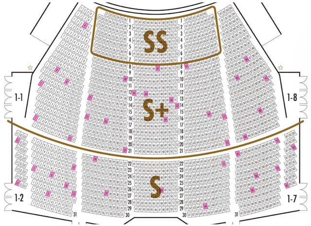 2026年1月1日の星組初日公演から座席区分の見直しによりA席がS席に、S席がS+席に変更になりました。これに伴い座席レイアウトを変更しています。